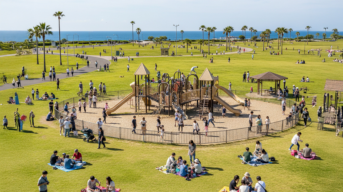 電線が地中化され、空が広く感じられる整然とした街並み。道幅が広く、歩道と車道がしっかり分離されているため、小さなお子様連れでも安心して歩けます。この美しい景観は、芦屋市全体の価値観を反映したものです。 - 圧倒的な「公園力」と「開放感」